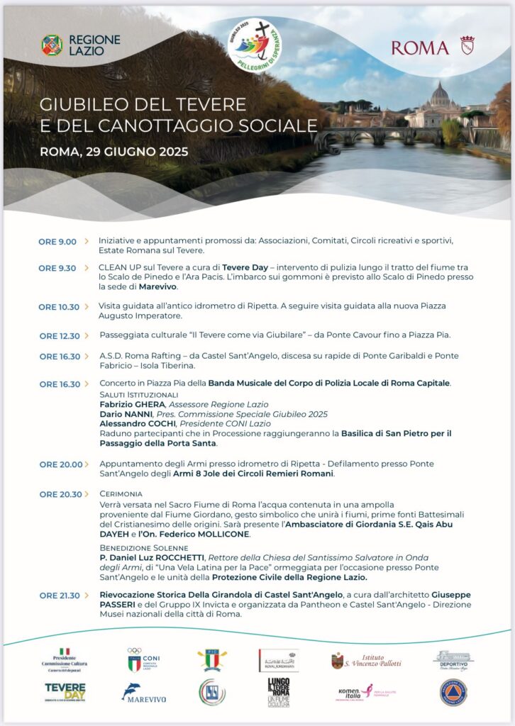 La giornata è promossa e organizzata dall’assessorato alla Tutela del territorio e del Demanio della Regione Lazio insieme alla Commissione Speciale di Roma Capitale per il Giubileo 2025, al Coni Lazio, alle Federazioni di Canottaggio e con la partecipazione: Tevere Day, Mare vivo, Deportivo e circoli sportivi.