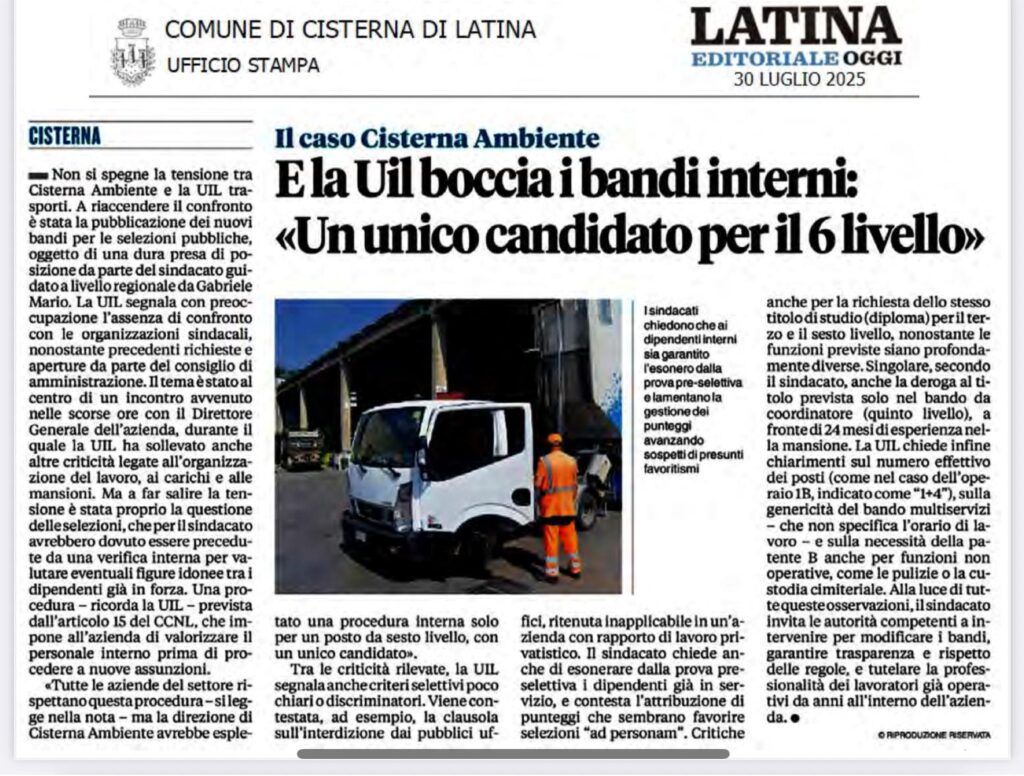 “Non si spegne la tensione tra Cisterna Ambiente e la UIL trasporti. A riaccendere il confronto è stata la pubblicazione dei nuovi bandi per le selezioni pubbliche, oggetto di una dura presa di posizione da parte del sindacato guidato a livello regionale da Gabriele