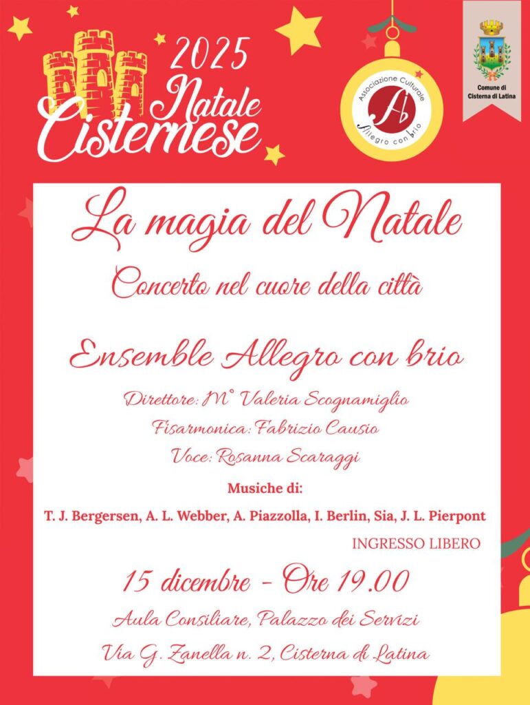 Tutto pronto per l’evento più atteso del Natale 2025 nel calendario del Natale Cisternese 2025. Concerto nel cuore della città, l’evento si terrà domani 15 dicembre e avrà inizio alle 19 presso l’aula consiliare del Comune di Cisterna di Latina.